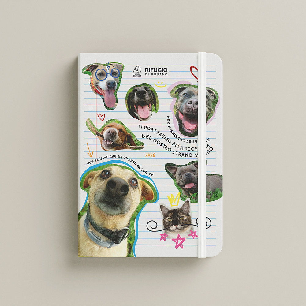 Questa agenda settimanale in formato A5 racconta le storie quotidiane dei nostri ospiti, con elastico di chiusura e segnapagina, offrendo un’occasione unica per seguire da vicino la vita dei cani del rifugio.