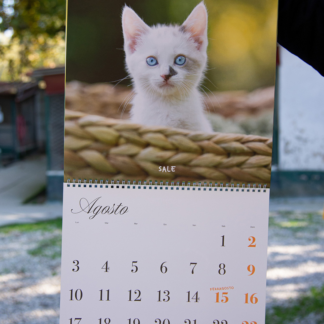 Abbiamo scelto di riproporre il formato da muro doppia pagina 32x32 cm, che una volta appeso diventa 32x64 cm, valorizzando al massimo le immagini di cani e gatti.